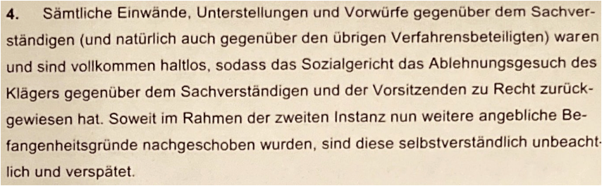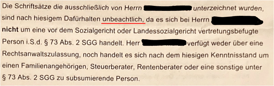 Es ist unwahr, dass diese Schriftsätze unbeachtlich seien. Lutz Köther ist im Sozialgerichtsgesetz (SGG) zuhause und kennt den § 73 SGG, das ergibt sich aus seiner juristischen Spezialisierung und daraus, dass er im betreffenden Schriftsatz aus ebendiesem Paragrafen zitiert….!