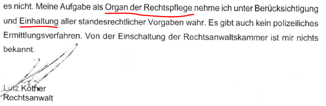 Es bleibt abzuwarten, ob und in welcher Weise die gegen RA Köther bereits erstatteten Strafanzeigen wegen mutmaßlich versuchten Prozessbetrugs sowie der von Köther verfassten eidesstattlichen Versicherung, Auswirkungen auf die Anwaltszulassung von Herrn Köther haben könnten.