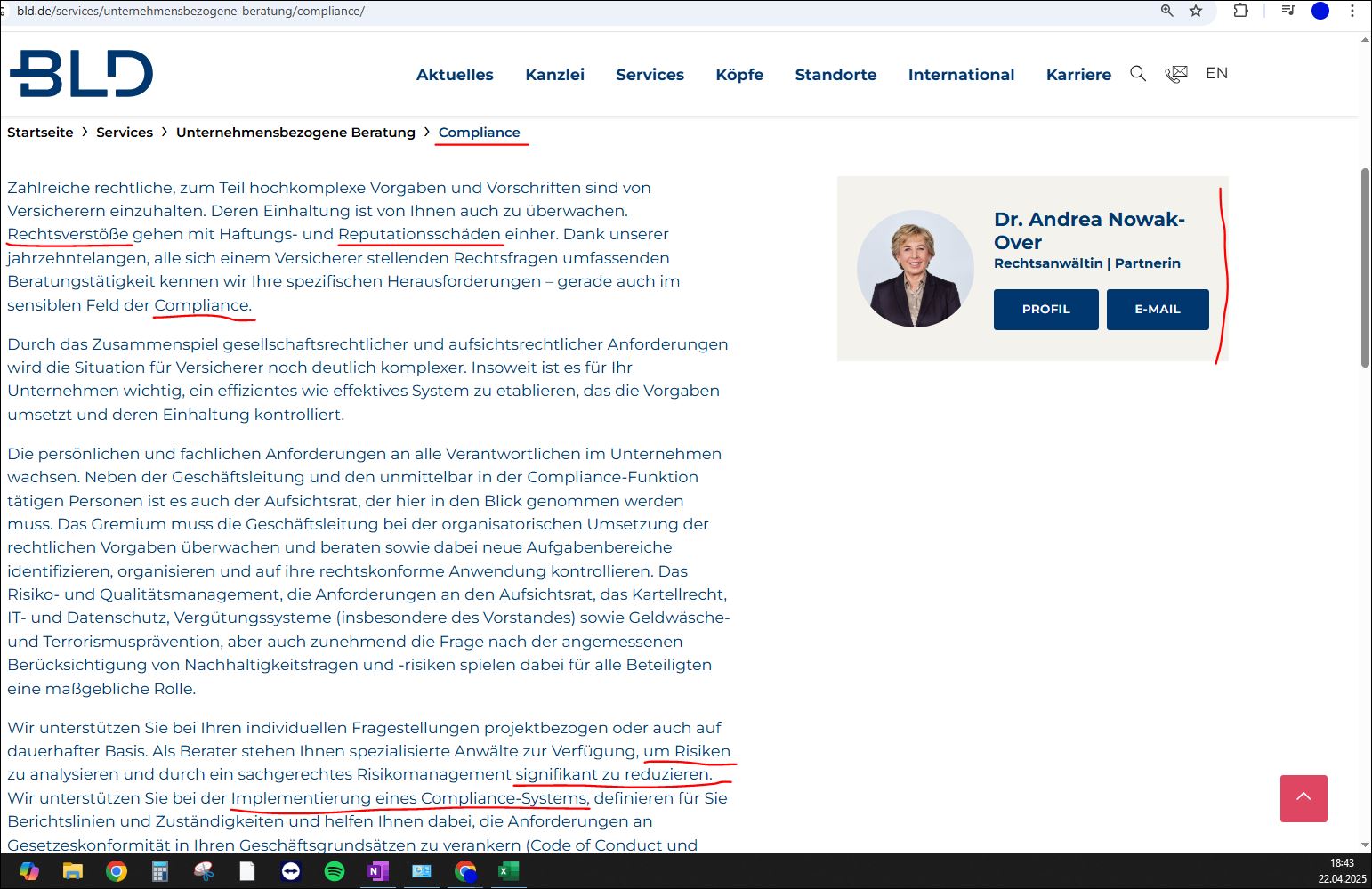 Besonders bemerkenswert ist, dass ausgerechnet Dr. Andrea Nowak-Over bei BLD als Leiterin der Compliance-Beratung tätig ist – jenem Fachgebiet, das Unternehmen helfen soll, sich rechtstreu zu verhalten, Haftungsrisiken zu minimieren und Reputationsschäden zu vermeiden.